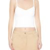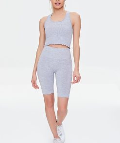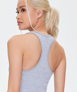 An athletic knit tank top featuring an allover ribbed construction. shoulder straps. a square-cut neckline. racerback. and a cropped lettuce-trim hem.