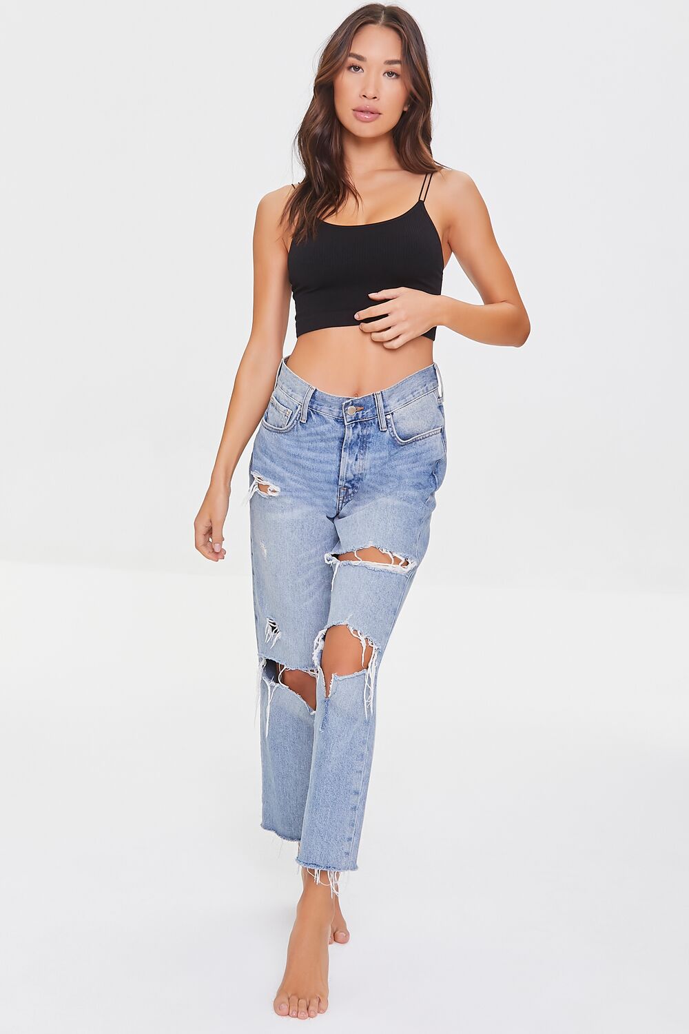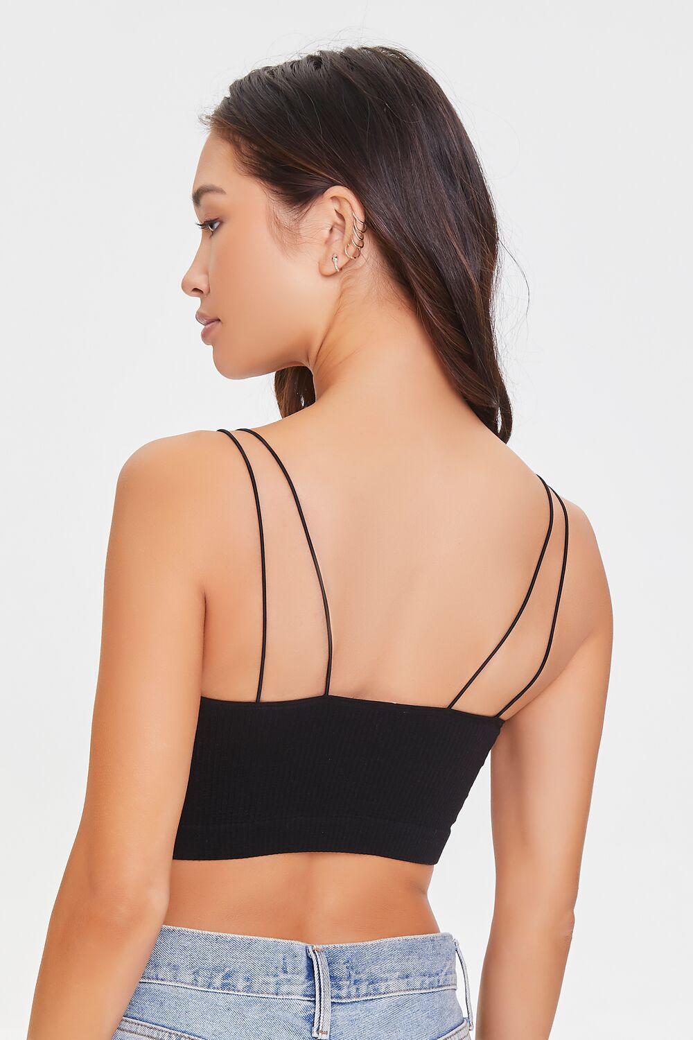 A seamless ribbed knit bralette featuring dual elasticized cami straps. scoop neck. straight back. and a longline hem.