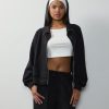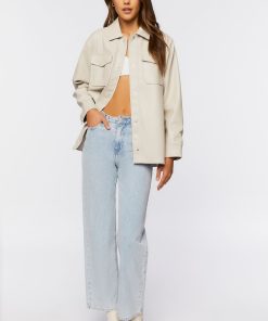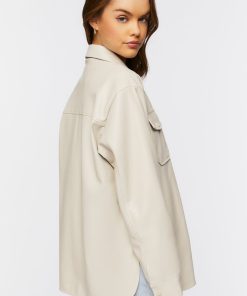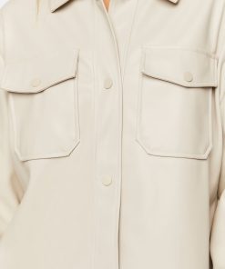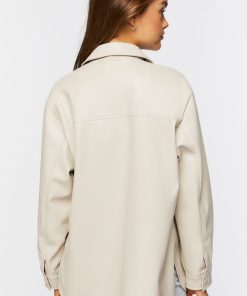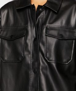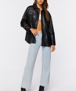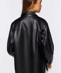 A faux leather shacket featuring a basic collar. snap-button closures on the chest flap pockets and front. dropped long sleeves. and a dolphin hem.