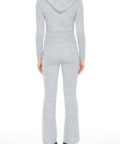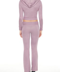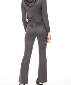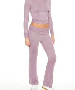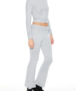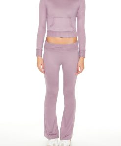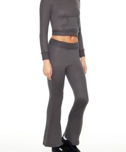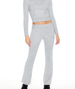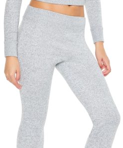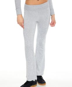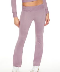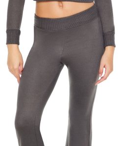 A pair of knit pants featuring ribbed trim. a mid-rise waist. and straight leg.
