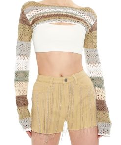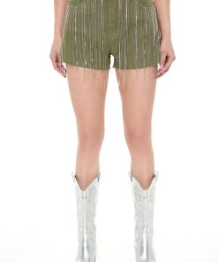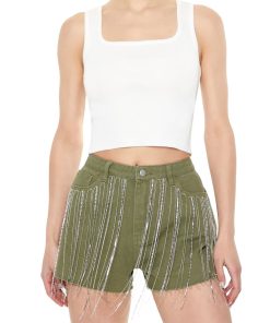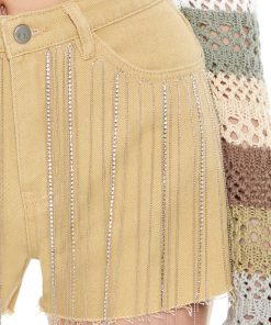 Crafted from non-stretch denim. this pair of shorts features rhinestone box chain fringe. a high-rise waist. belt loops. zip fly and button-front closure. five-pocket construction. and frayed trim.