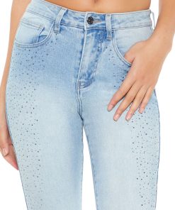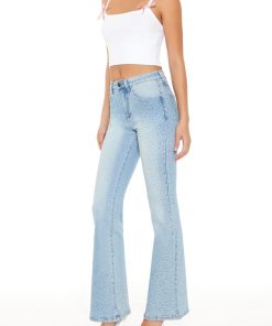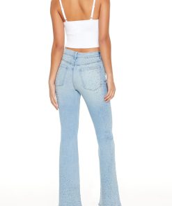 Crafted from stretch-denim. this pair of jeans features allover rhinestone embellishments. a high-rise waist. belt loops. zip fly and button-front closure. flare leg. and five-pocket construction.