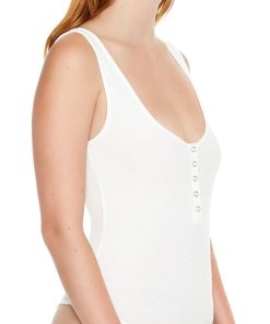 A ribbed knit tank bodysuit featuring shoulder straps and a snap-button placket.