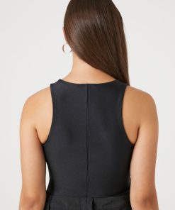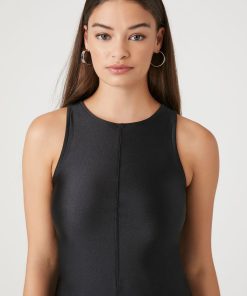 A knit bodysuit featuring a sleeveless cut. round neckline. and a seam construction.