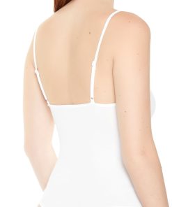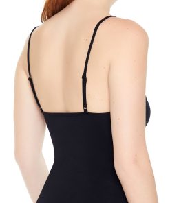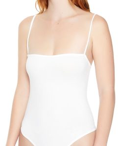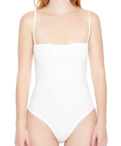 A seamless knit bodysuit featuring a straight-cut neckline and back. thong bottom cut. and adjustable cami straps.
