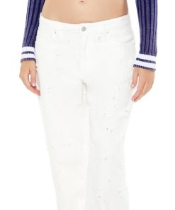 A pair of twill pants featuring belt loops. a five-pocket construction. mid-rise waist. and straight leg.